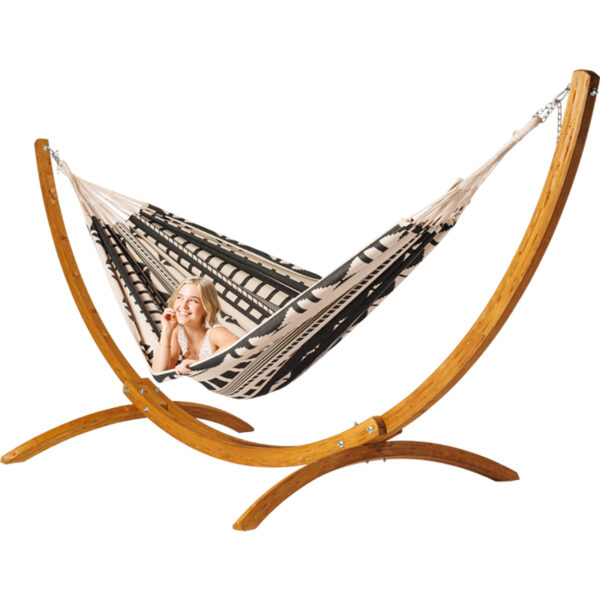 Gecombineerd met houten houten standaard Bow, gemaakt van hoogwaardig en duurzaam Scandinavisch fijnsparrenhout. Stijlvol, eenvoudig op te zetten en te verplaatsen. Deze hangmat met houten standaard is een ware toevoeging aan je meubilairair.