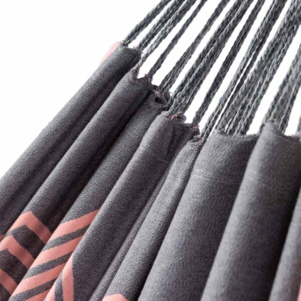 Met 64 ophangkoorden zorgt deze hangmat voor een ongeëvenaard gevoel van gewichtloosheid, maar dragen ze ook bij aan de stabiliteit en stevigheid van de hangmat.