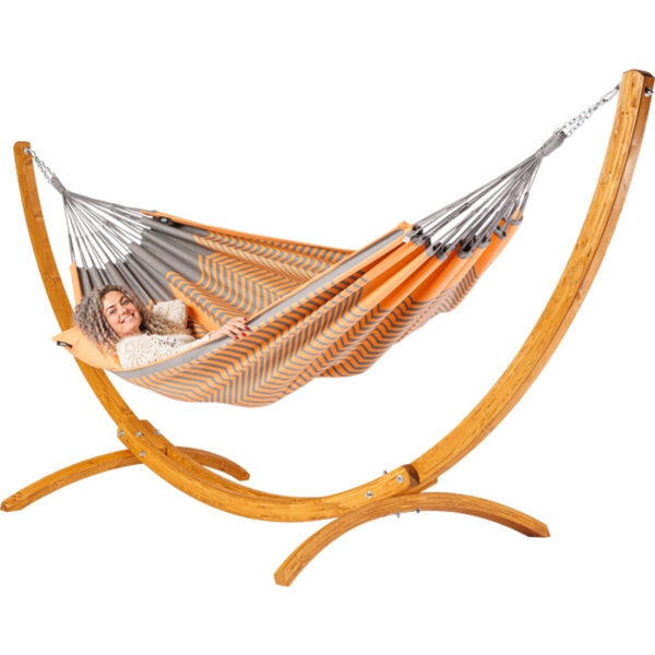 Gecombineerd met houten hangmatstandaard Bow, gemaakt van hoogwaardig en duurzaam Scandinavisch fijnspar. Stijlvol, gemakkelijk op te zetten en te verplaatsen. Deze hangmat met houten standaard is een echte aanvulling op je meubels.
