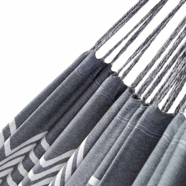Met 64 ophangkoorden zorgt deze hangmat voor een ongeëvenaard gevoel van gewichtloosheid, maar dragen ze ook bij aan de stabiliteit en stevigheid van de hangmat.