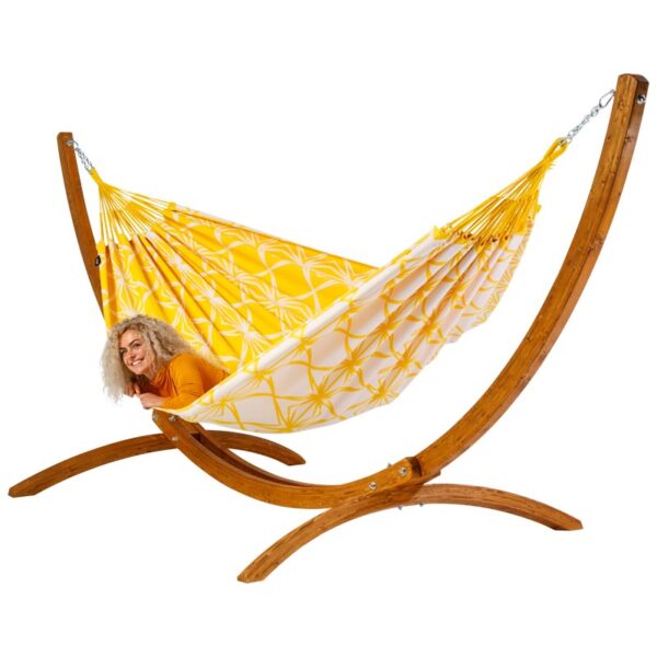 PakjeRust met hangmat met houten standaard Stars of Olympus. In deze hangmat van Luilak doezel je weg, denkend aan de rijke flora en fauna, eindeloze vergezichten en Griekse mythologie. De Stars of Olympus is geel met wit. Geïnspireerd op de sterren van het Griekse Olympus. Deze prachtige gele hangmat geeft je de rust en ruimte die je nodig hebt om volledig weg te dromen.