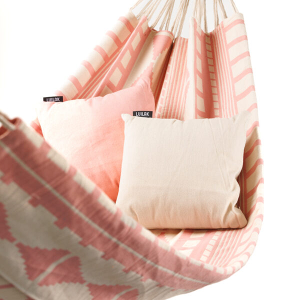 Het Kussen Boho is zachtroze, geïnspireerd op de trendy Bohemian stijl van Ibiza. Deze prachtige zachtroze hangmat straalt de charme en allure van het zomerse Ibiza uit.